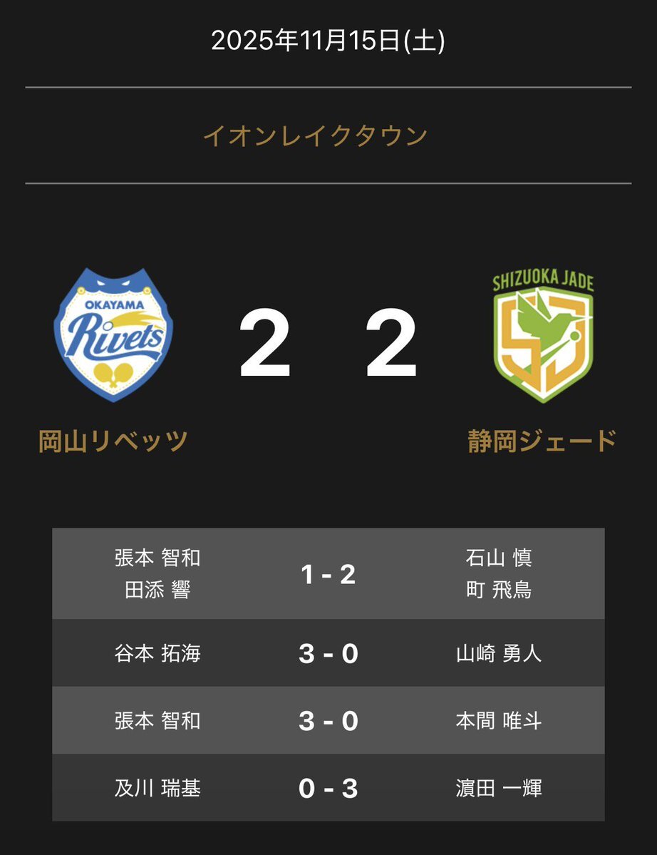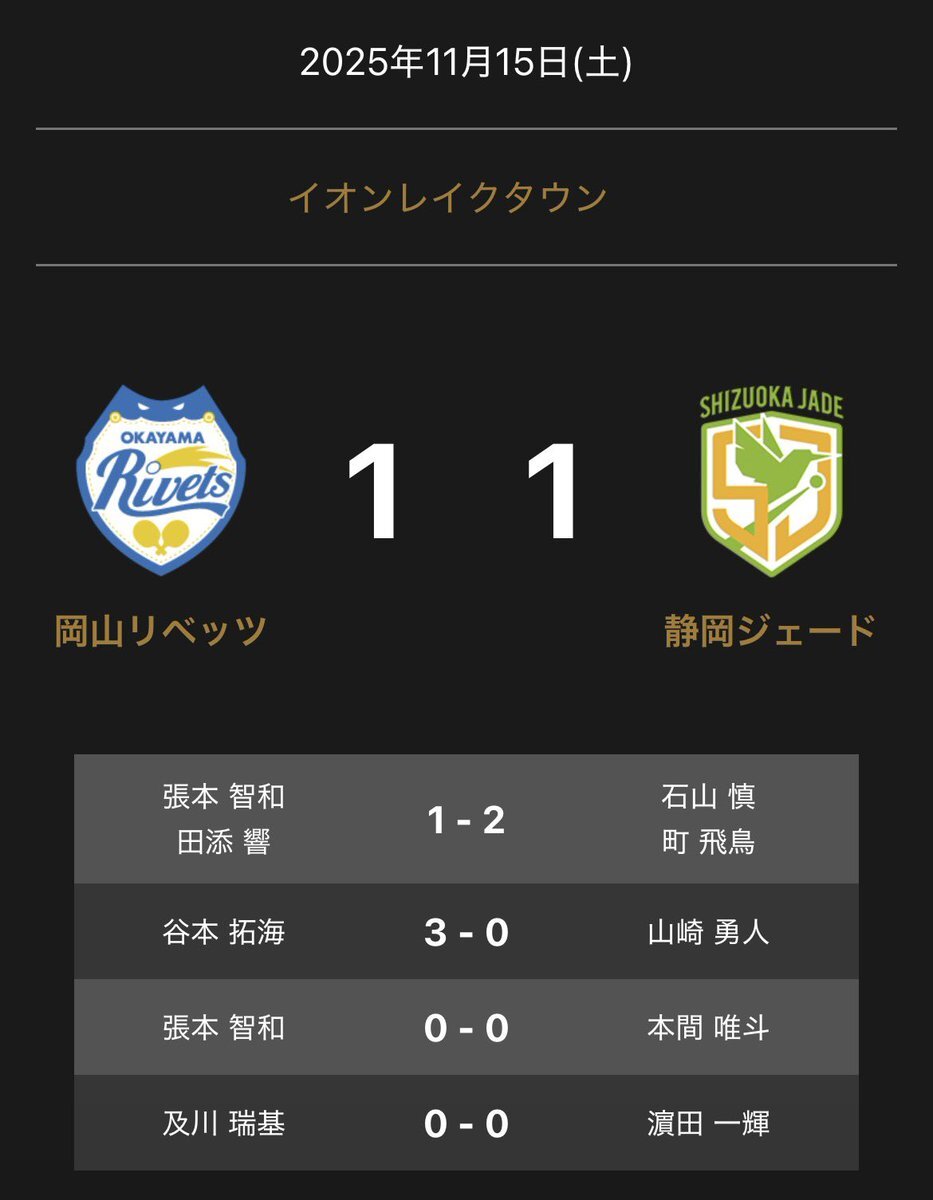 🏓#ノジマTリーグ  2025-2026シーズン 🗓️11月15日(土)⏰12:00試合開始 📍イオンレイクタウン越谷 #岡山リベッツ 1-1 #静岡ジェード 第2マッチは #谷本拓海 選手が勝利しました! #谷本拓海 3-0 #山崎勇人 第3マッチは #張本智和 - #本間唯斗 です! pic.x.com/KPi2lIsqmg