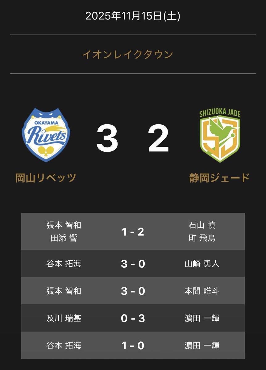 🏓#ノジマTリーグ  2025-2026シーズン 🗓️11月15日(土)⏰12:00試合開始 📍イオンレイクタウン越谷 #岡山リベッツ 3-2 #静岡ジェード ビクトリーマッチは #谷本拓海 選手が勝利しました! これにより本日の試合は、#岡山リベッツ が勝利しました!✨ #谷本拓海 1-0 #濵田一輝 pic.x.com/ihFTAt369g