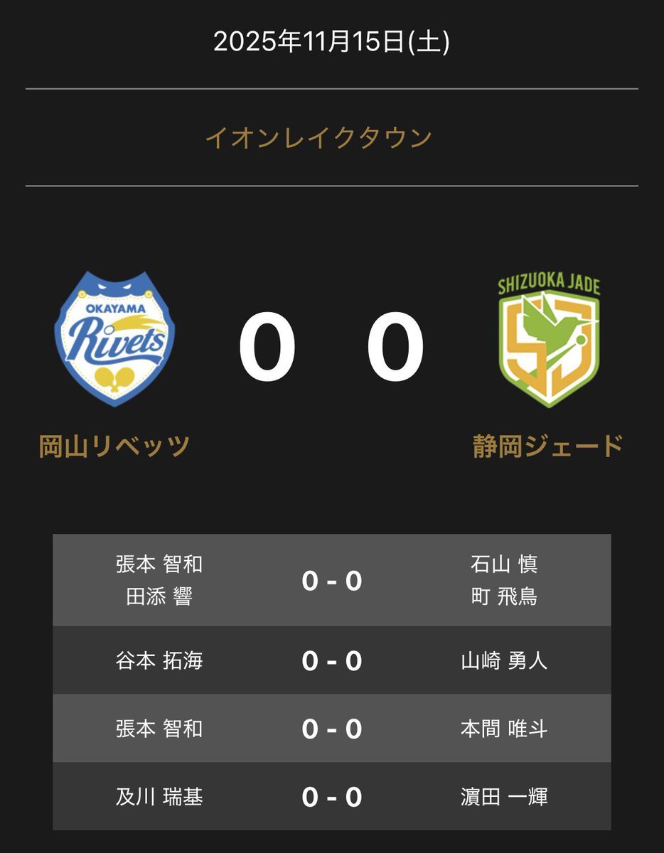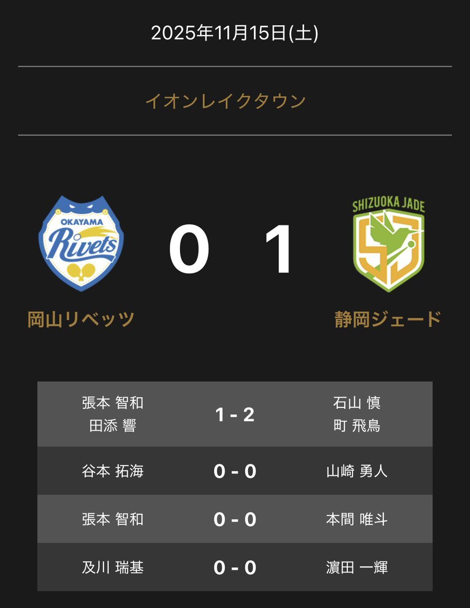 🏓#ノジマTリーグ  2025-2026シーズン 🗓️11月15日(土)⏰12:00試合開始 📍イオンレイクタウン越谷 #岡山リベッツ 0-1 #静岡ジェード 第1マッチは #静岡ジェード ペアが勝利しました! #張本智和/#田添響 1-2 #石山慎 /#町飛鳥 第2マッチは #谷本拓海 - #山崎勇人 です! pic.x.com/pSol9YB3fB