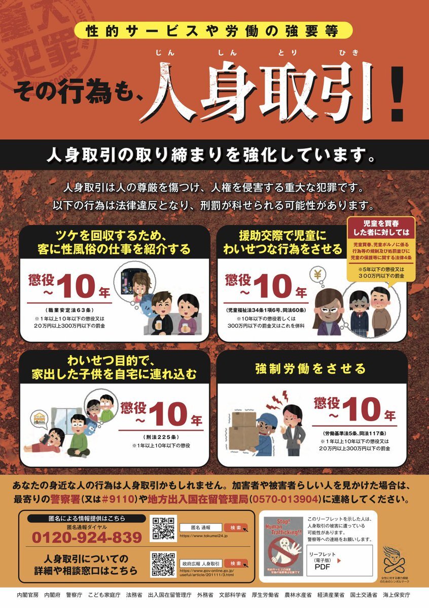 内閣府男女共同参画局は毎年「人身取引対策ポスター」を発表している。相談や通報を呼びかける内容だ。 ところが刑法をはじめ各種法律をみても拘禁刑(旧・懲役)10年が上限だ。万引き(窃盗罪;刑法235条)と同じ。重大な人権侵害に見合わない刑の軽さだ。ポスターの強いメッセージにもそぐわない。