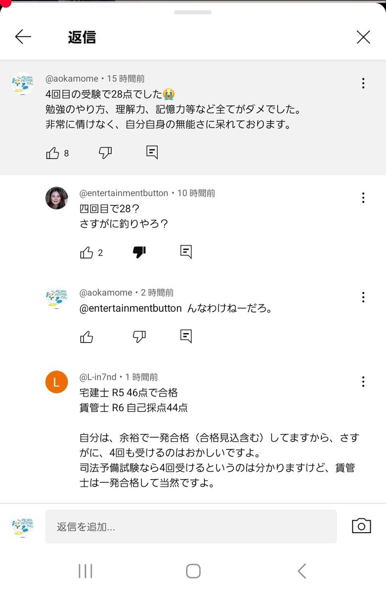 みんな! 宅建試験、賃貸不動産経営管理士試験に合格しても、スクショに載せてある自慢コメントしたりするのは、ダメですぞ! なぜなら、スクショのやり取り見れば分かります( ˇωˇ ) #宅建 #賃貸不動産経営管理士
