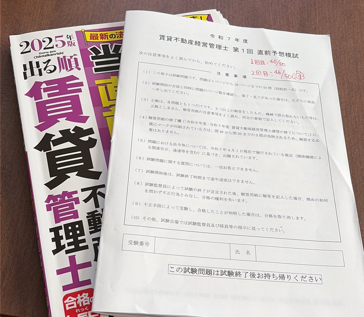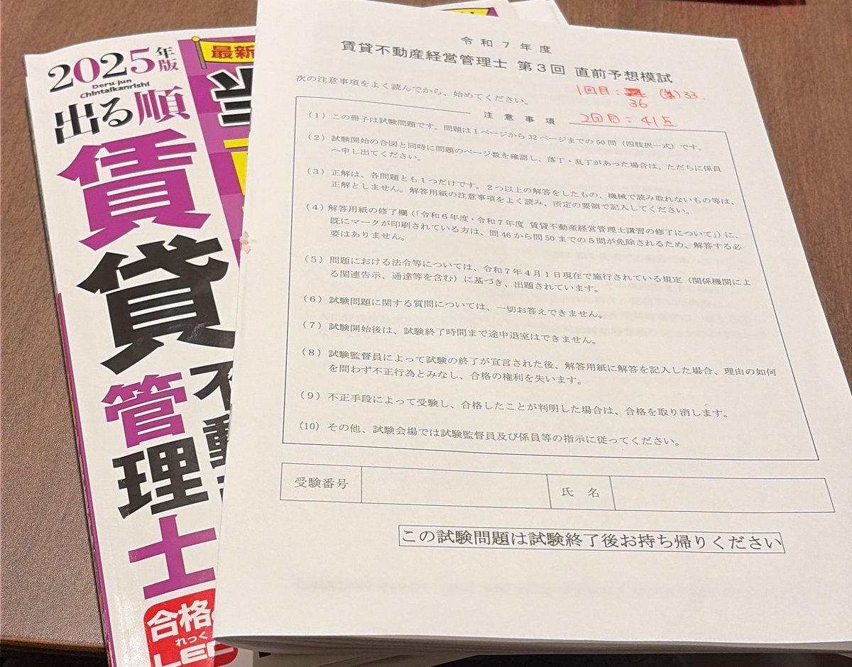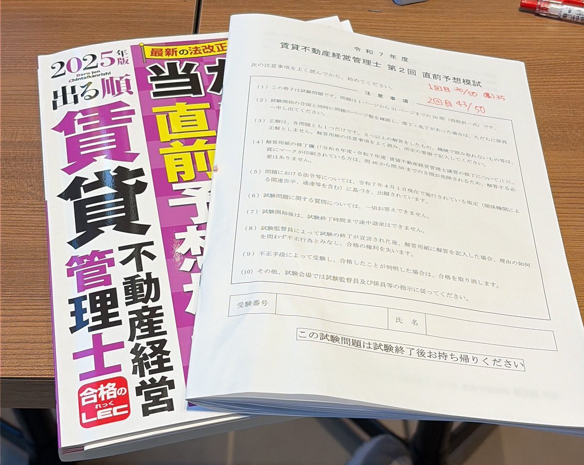 LEC直前予想模試[2]2回目43点 1回目やった時、30点だったから焦ったけど、2回目は43点だったから一安心。この調子であと模試4つ😭 #賃貸不動産経営管理士 pic.x.com/xzxngfGz37