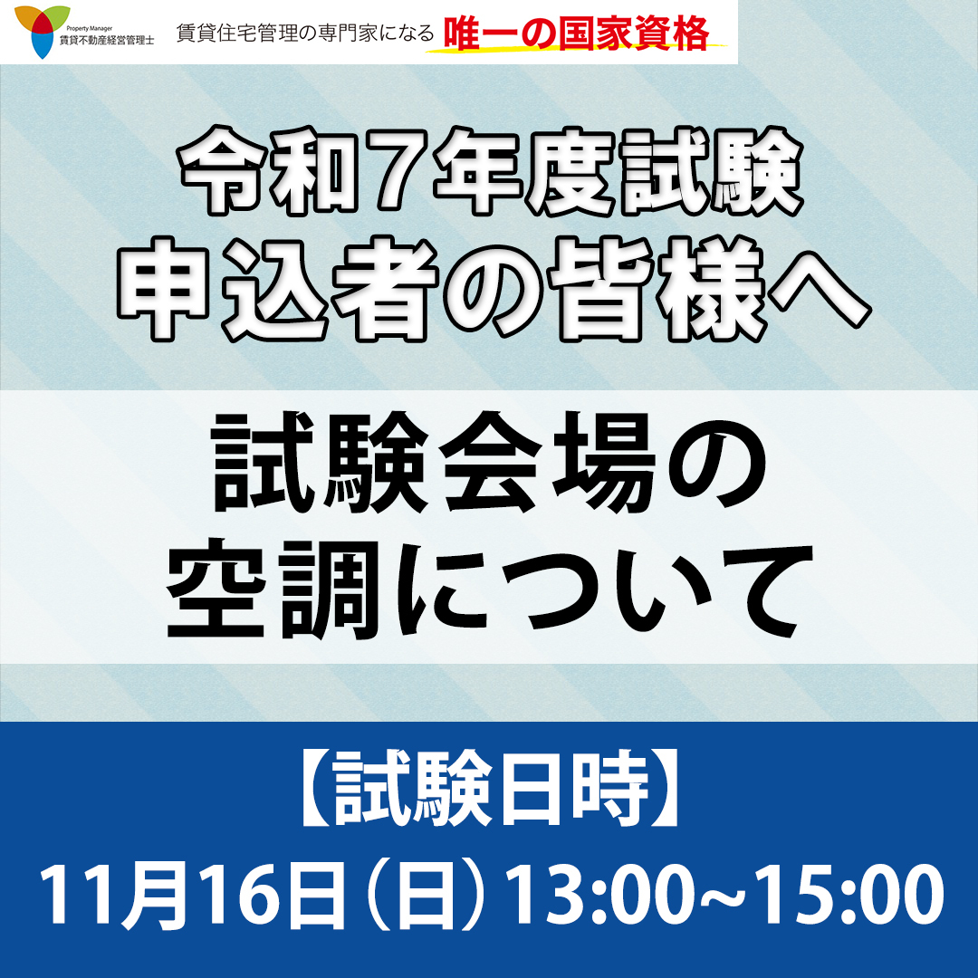 【令和7年度試験受験者の皆様へ】 賃貸不動産経営管理士試験 試験会場の空調について 試験当日、会場によっては 冷暖房が入らない場合があります。 体温調整がしやすい服装で お越しください。 その他注意事項等は 受験申込案内書に記載しております⇩ chintaikanrishi.jp/assets/common/…