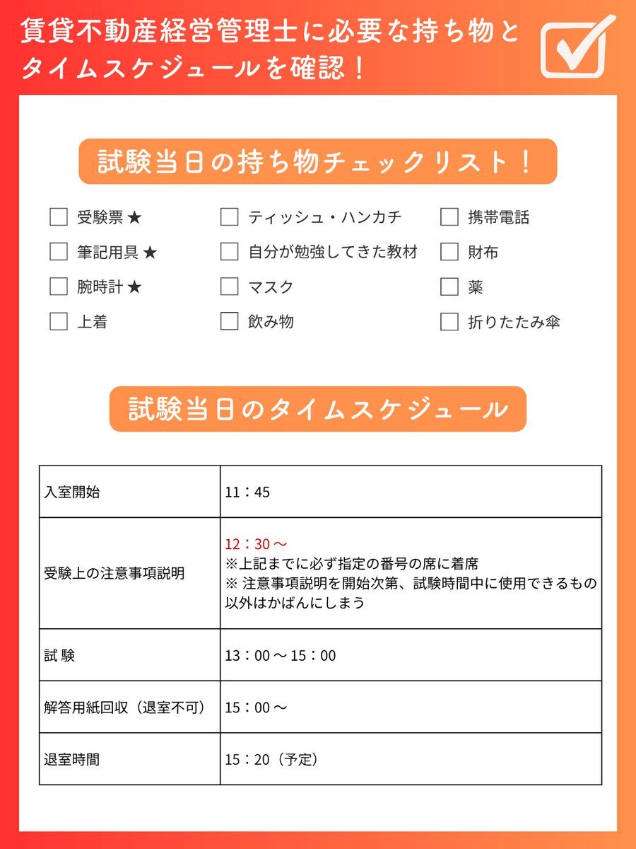 【令和7年度試験まで残り2週間!】 賃貸不動産経営管理士試験 試験当日の時間割について 添付画像をご確認のうえ、 試験会場にお越しください。 その他注意事項等は 受験申込案内書に記載しております⇩ chintaikanrishi.jp/assets/common/…