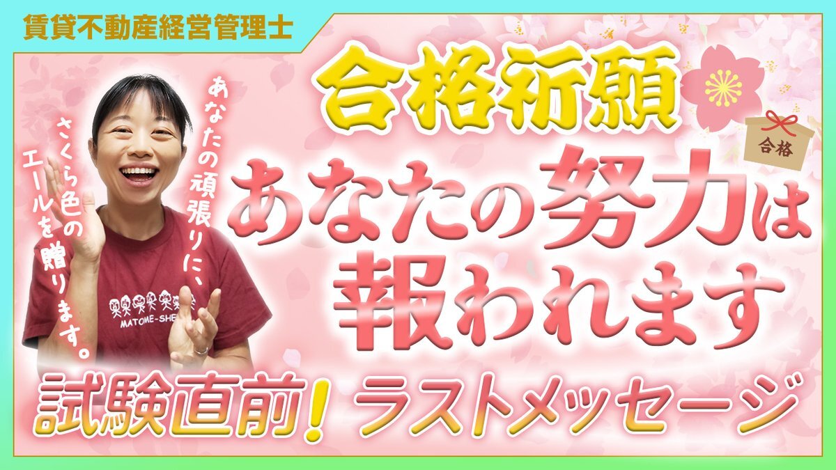 【本日18時動画公開🎥】 【賃貸不動産経営管理士】合格祈願🌸あなたの努力は報われます〜試験直前ラストメッセージ〜_第52回 🌸 さあ #賃貸不動産経営管理士試験 本番まであと少し! くじけず積み重ねた日々が、いま花ひらく🌸 らすとメッセージとして、エールを贈ります💪 🌸 #直前対策 #合格祈願 pic.x.com/Rd5GfkKRy8