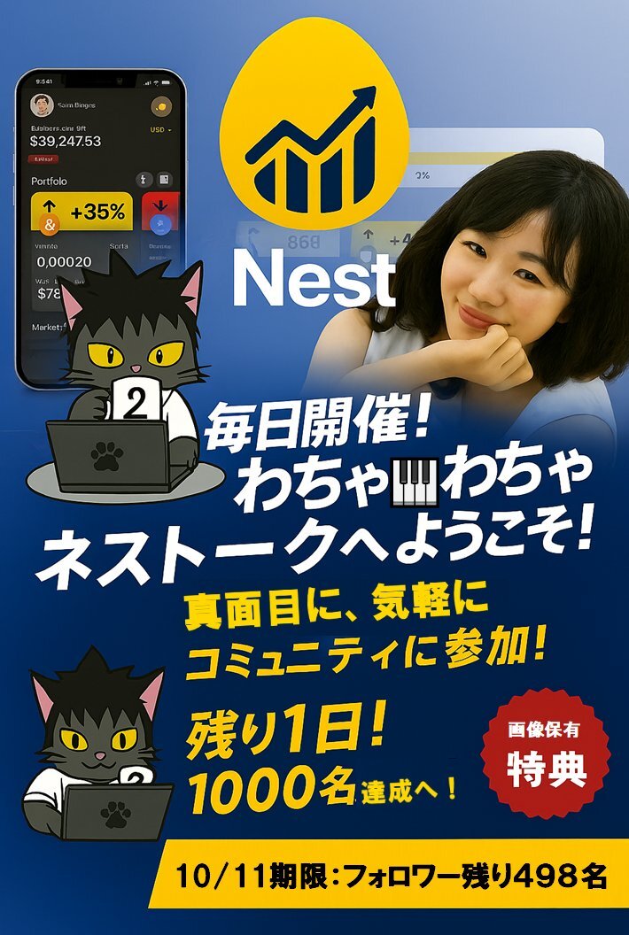 Nestのアプリ、今後の暗号通貨社会で資産管理を家計簿のような感じで使えて必ず必要になってくると思いますクリ☺︎🌰📊📈📉 アプリ開発のためにも是非FiNANCiE内の【Nest】コミュニティのフォロー、拡散のご協力をお願いしますクリ☺︎🌰 1,000人達成まで残り581人! #暗号通貨 #資産管理 #アプリ開発 x.com/cat_man0311/st…