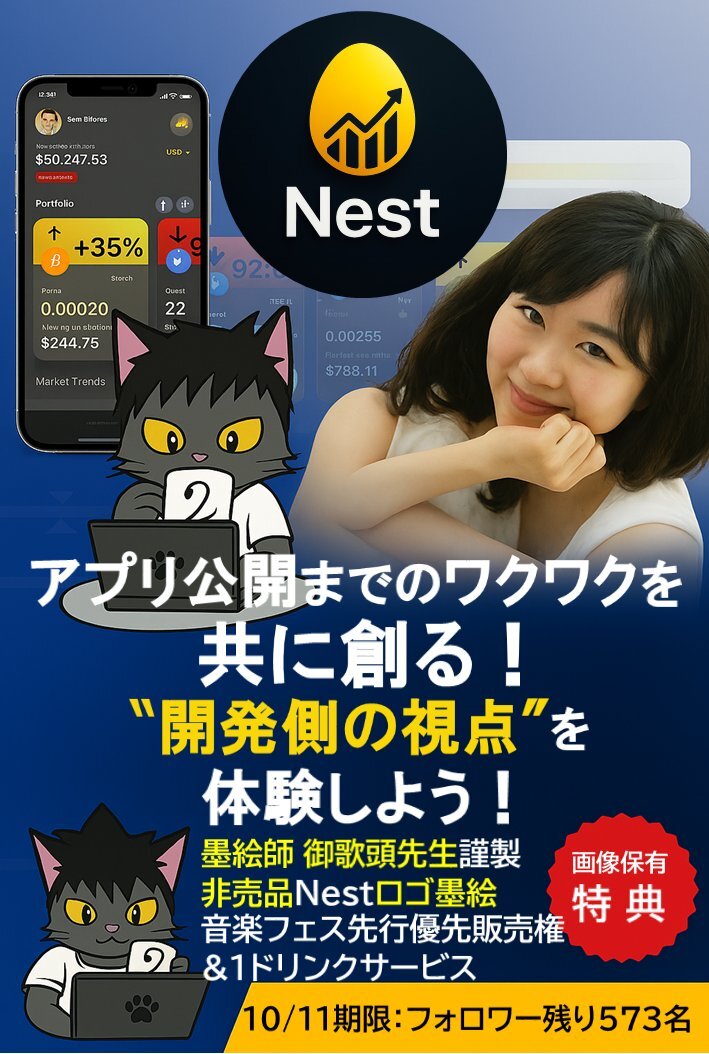 🚨 10/11期限:未来のアプリを共に創る"開発者目線"の体験をしませんか?🚨 #Nest #FiNANCiE #フィナンシェ #Web3 #Roadto1000 #仮想通貨 #BTC #暗号資産 #共創 #資産管理 #投資初心者 暗号資産トラッキングサービスNest(@cat_man0311)様が FiNANCiEでRoad to 1,000に挑戦中! x.com/cat_man0311/st…