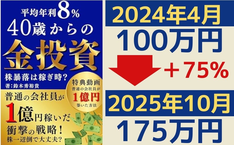 【金って買ったほうがいいの?】 1年半前に出版した「40歳からの金投資」。あの時、もし100万円で金を買っていたら、なんと今175万円になっていたはず‼️ 「もう遅い?」 個人的には「そんなことない」「まだまだ上がる」と思ってて、今も全力積立中です❗️ 書籍はリプ欄から⤵️