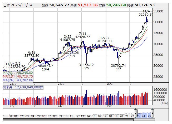 高値で利食い売りが発生。 日経平均は51,513円で新高値も、終値は50,376円と大幅安。長期トレンドは依然として強いが、短期的な調整のサインか。 #投資 #資産運用 #株式投資 #FX #副業 #お金 #資産形成 #日本株 #米株 #投資初心者 pic.x.com/6FJ8VWu2KX