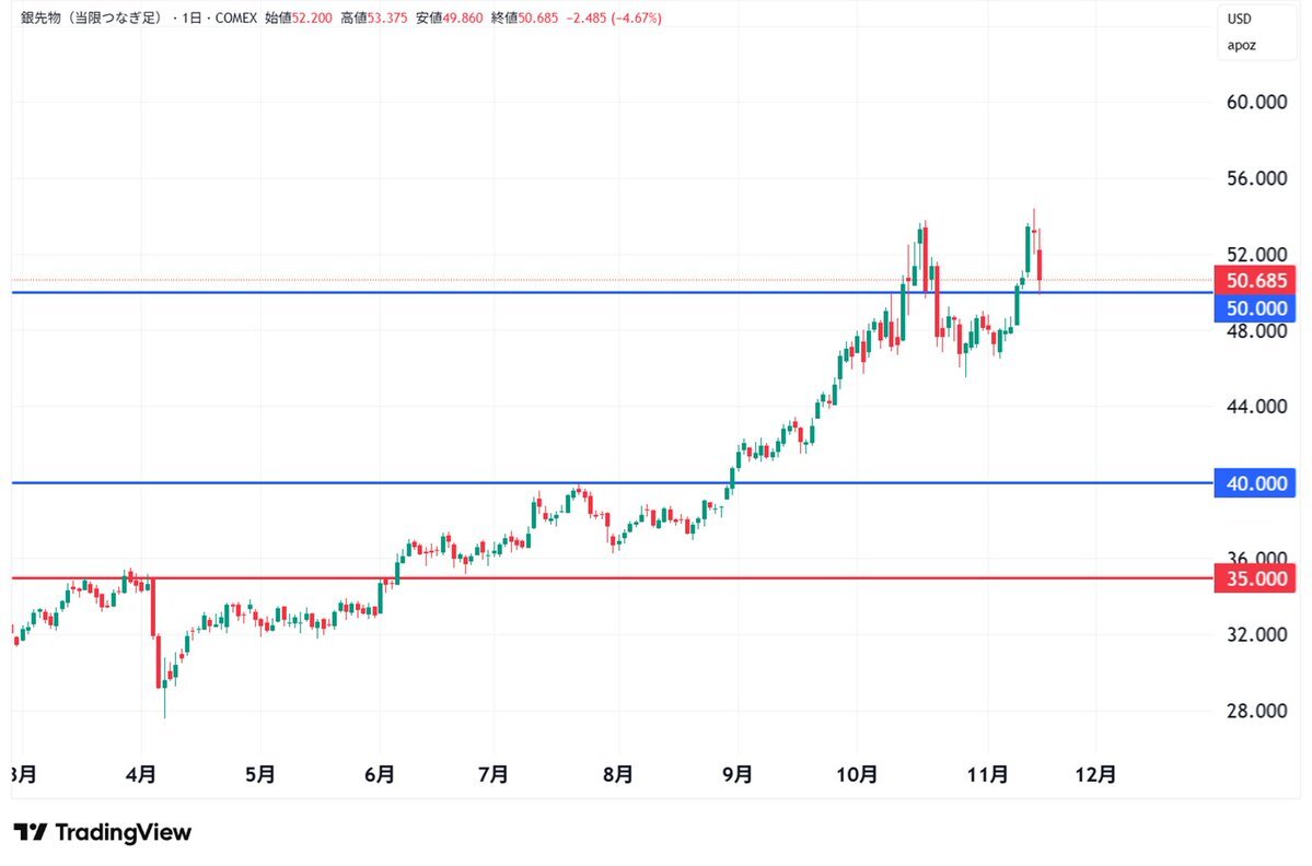 シルバーは50ドルをきれいに抑えられていて、まだまだ短期的にも強気な気がしますね #投資 #資産運用 #シルバー pic.x.com/aUB6Yuy7jt