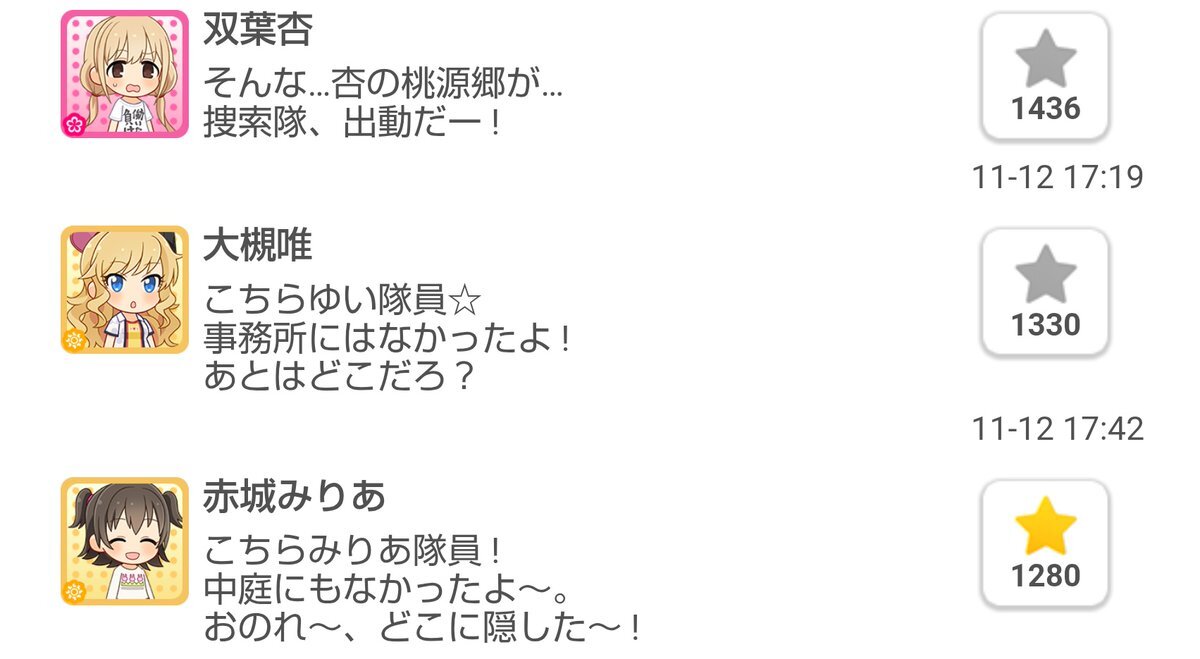 #赤城みりあの今昔話】 本日11/22は1と2がゾロ目の日ですが、デレぽ1年目の11/22に野々村そらちんが11時22分に"いちいちにーにー"投稿を流し、それにみりあが"12時21分"に返信をつけました #デレぽ pic.x.com/GSn4kVU5oG
