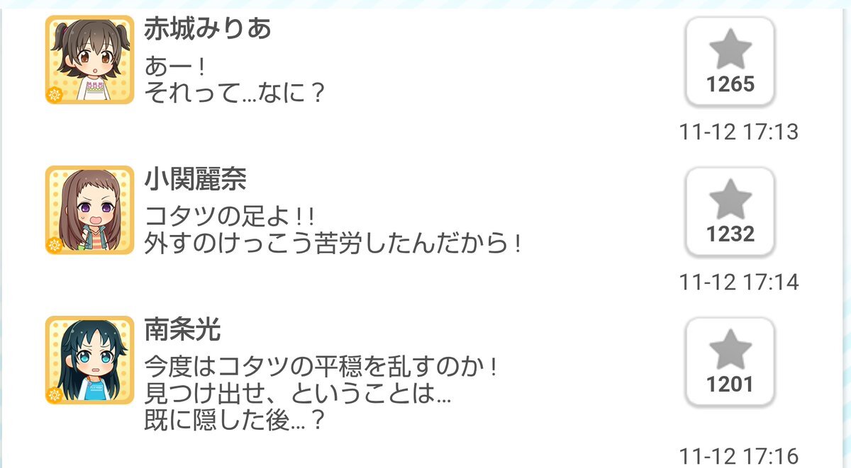 #赤城みりあの今昔話】 先月、レイナンジョーによる連日の投稿により、"善悪"両サイドへの行き来を楽しんでいた赤城みりあちゃんを紹介しましたが、その翌月(11/12)にレイナサマが"コタツの足"を隠すと、みりあはコタツの足を探す光サイドに加わり、芝居がかった捜索報告を流しました #デレぽ pic.x.com/qfg1mMgeUI x.com/miriacord/stat…