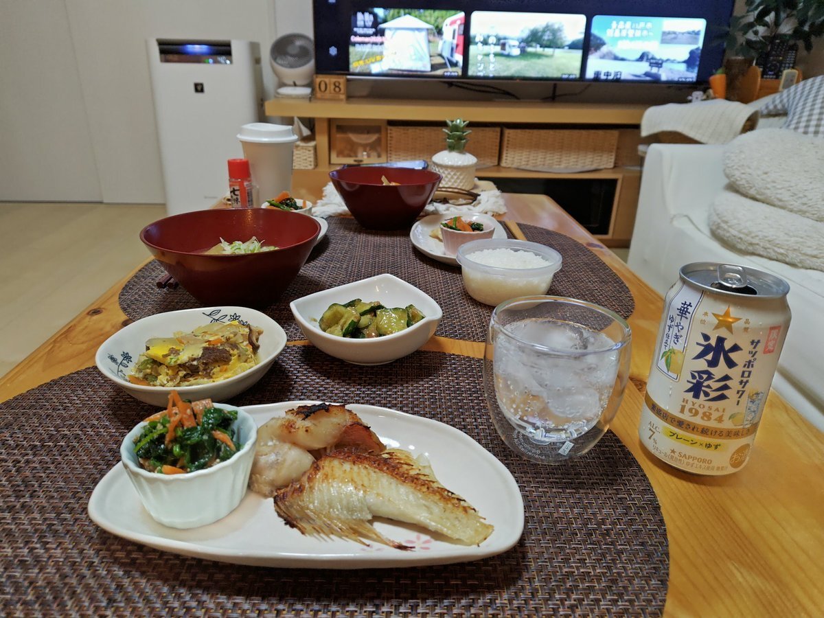 今週もお疲れ様でーす🍻 晩ごはん🌃は #赤魚の粕漬け #ほうれん草の胡麻合え #キュウリの山椒合え #牛肉の卵とじ #芋煮汁 #サッポロサワー氷彩 で頂きまーす😋 pic.x.com/WfqsFwom7s