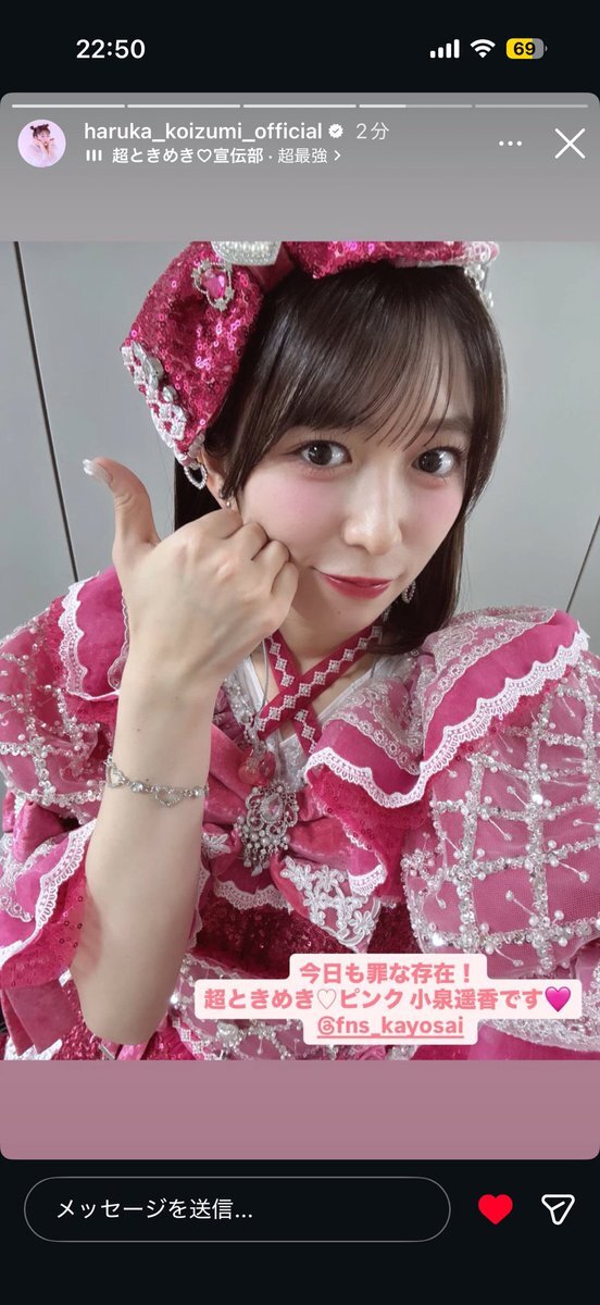 返信先:@amane_fz1026月足天音さんも中西アルノさんも、#超ときめき宣伝部 の #小泉遥香 とコラボしていただきありがとうございました🫶🏻🩷 素敵なコラボで一宣伝部として幸せでした🫶🏻🩷 音楽番組でまた共演する際はよろしくお願いします✨ #FNS歌謡祭