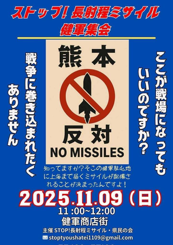 11/9 11:00~12:00 熊本市の健軍商店街で ストップ!長射程ミサイル配備 反対集会が開催されます。 日本で最初に長射程ミサイルが地上配備されることになっているこの地で、配備を止めることは極めて重要です! #長射程ミサイル配備反対 #戦争反対憲法守れ facebook.com/share/r/1Gd67a…