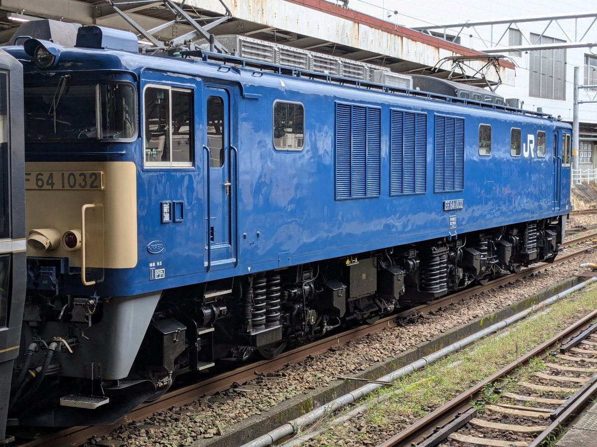 11月 1日(土)、長岡駅南部構内(旧長岡車両センター)。 「越後湯沢駅100周年号」用の編成。EF64-1031,ばんえつ物語用の客車、EF64-1032。出区前、10:30頃。 #EF64 #新潟車両センター #越後湯沢駅100周年号 pic.x.com/W20AOer5qF