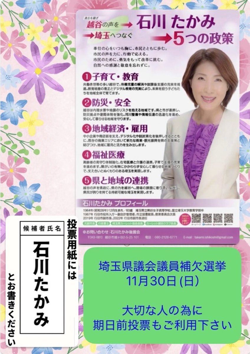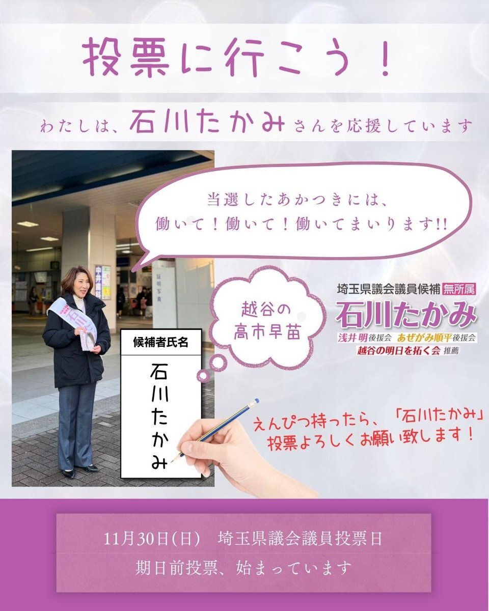 #埼玉県議会議員補欠選挙 #越谷の高市早苗 石川たかみ クリーンな候補者、当選あるのみ です #越谷をさらなるたかみへ #えんぴつ持ったら石川たかみ x.com/takami_ishikaw…