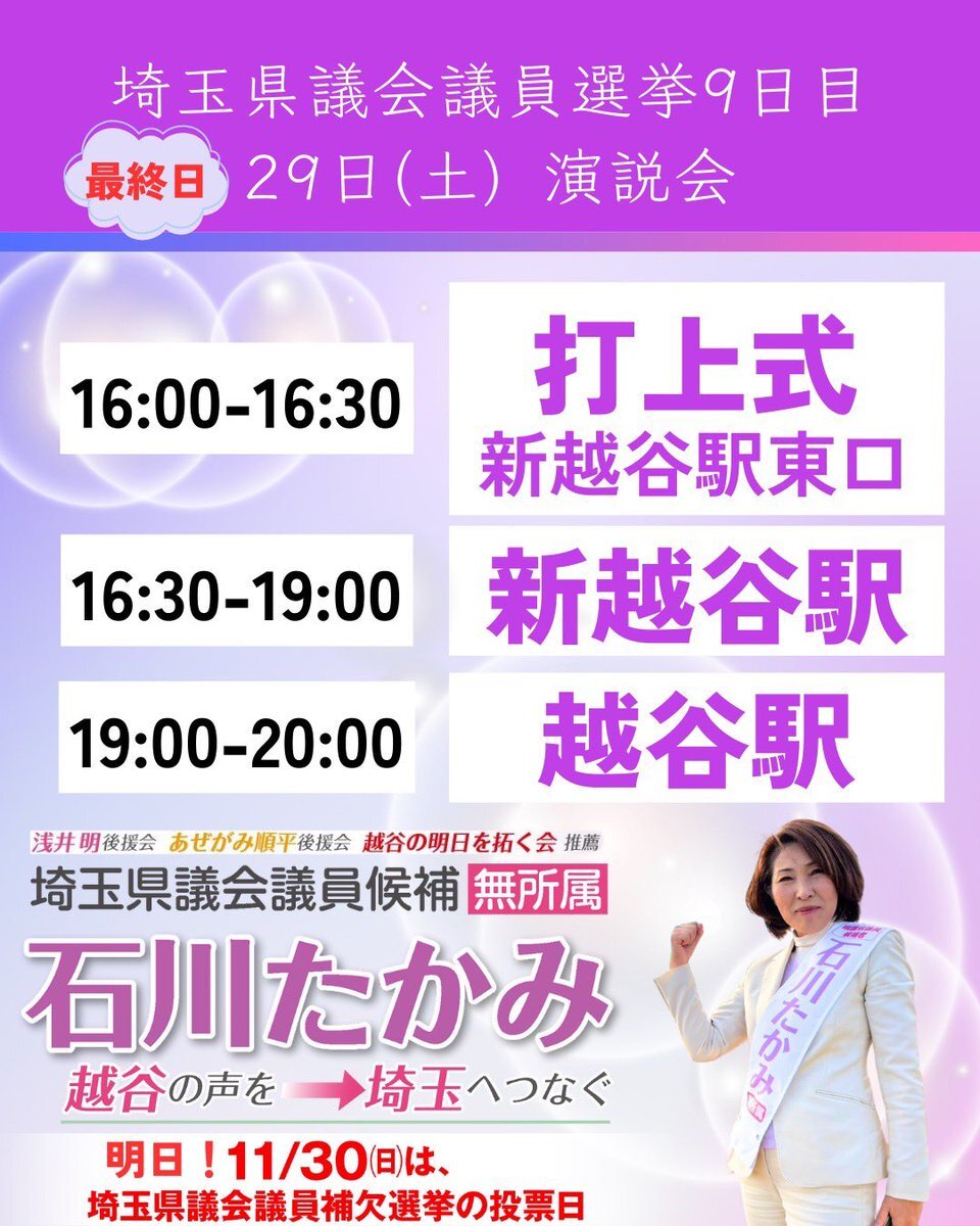 【 #石川たかみ 候補情報 最終日⑤】 越谷駅にて、最後の最後の、魂の演説をお聞きください‼️ #埼玉県議会議員補欠選挙 #越谷市 #えんぴつ持ったら石川たかみ #越谷をさらなるたかみへ pic.x.com/i16hoXjRlw