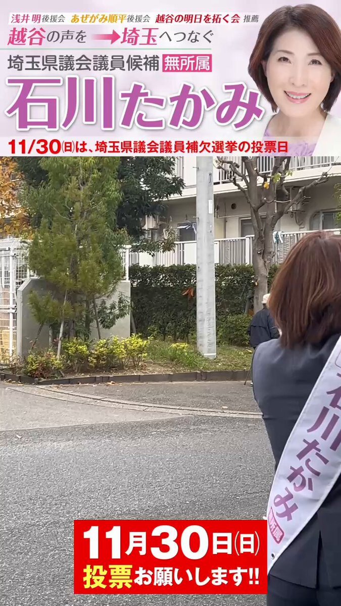 💬市民の皆さんの活動力に惚れたんです‼️ 『#石川たかみが越谷で活動する理由』 (市政報告会での切り抜き) __ 明日11月30日(日)は #埼玉県議会議員補欠選挙 期日前投票はじまってます! 手ぶらでOK🗳️ 皆さんの声を一票にのせて届けてください! #越谷をさらなるたかみへ pic.x.com/a87CD97iZu