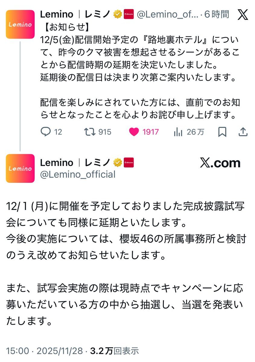 Lemino、櫻坂46出演ドラマの配信延期を発表「クマ被害を想起させるシーン」完成披露試写会も延期(スポニチアネックス) #路地裏ホテル #櫻坂46 #仲村トオル news.yahoo.co.jp/articles/b4e09…