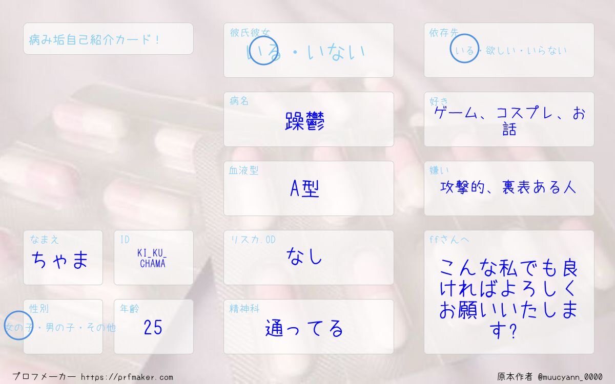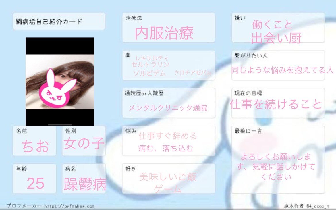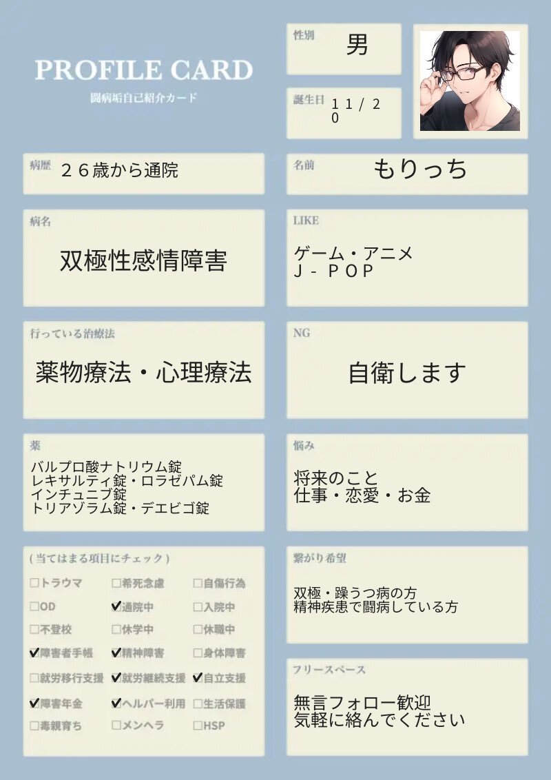 もりっちです。 自己紹介カード更新しました。 気軽に絡んで下さい。 よろしくお願いします。 #闘病垢自己紹介カード #闘病垢さんと繋がりたい #精神疾患持ちのための自己紹介カード #精神疾患を持つ方と繋がりたい #双極症 #双極性障害 #躁うつ病 #躁鬱病 pic.x.com/BC4uN1DnRi