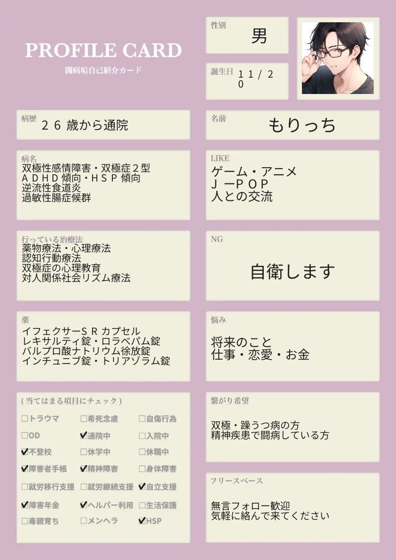 もりっちです。 自己紹介カード更新しました。 気軽に絡んで下さい。 よろしくお願いします。 #闘病垢自己紹介カード #闘病垢さんと繋がりたい #精神疾患持ちのための自己紹介カード #精神疾患を持つ方と繋がりたい #双極症 #双極性障害 #躁うつ病 #躁鬱病 #ADHD #HSP pic.x.com/mQ1pnMPmoC