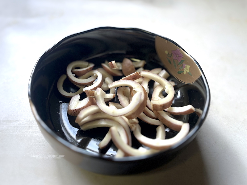 アケビと言ったら皮でしょって人もいる、その皮 猫が寝ている間にやっちゃおうと、水に晒して軽くアク抜きして 水からあげた端からどんどん茶色くなってゆくので サクサクっと味噌炒めにしちゃいます #身近な木の実 . pic.x.com/w8iPSba7ru x.com/juzo_tw/status…