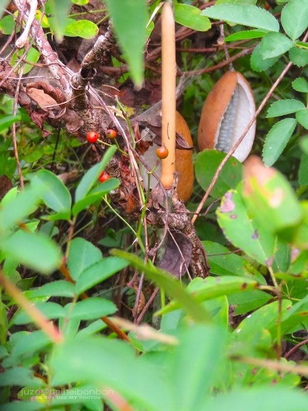 この辺のアケビはほとんど動物に食べ尽くされたと思っていましたが なるほど、野薔薇の棘ががっちりガードしていたとは 眠れる森の美女ですね #花と草 #身近な木の実 . pic.x.com/xiSUXiPWFp