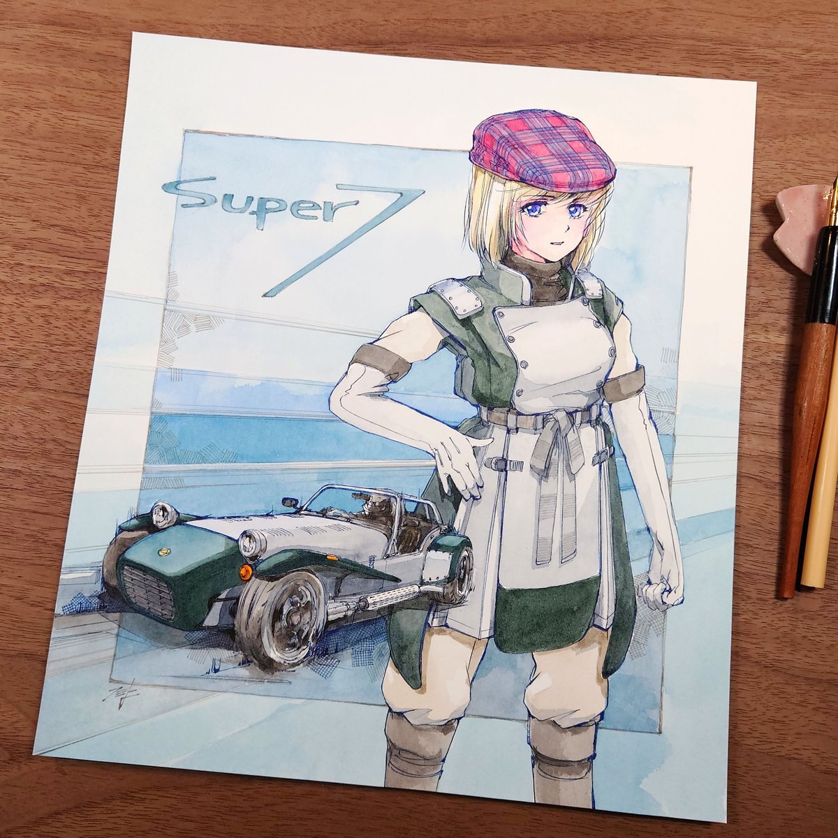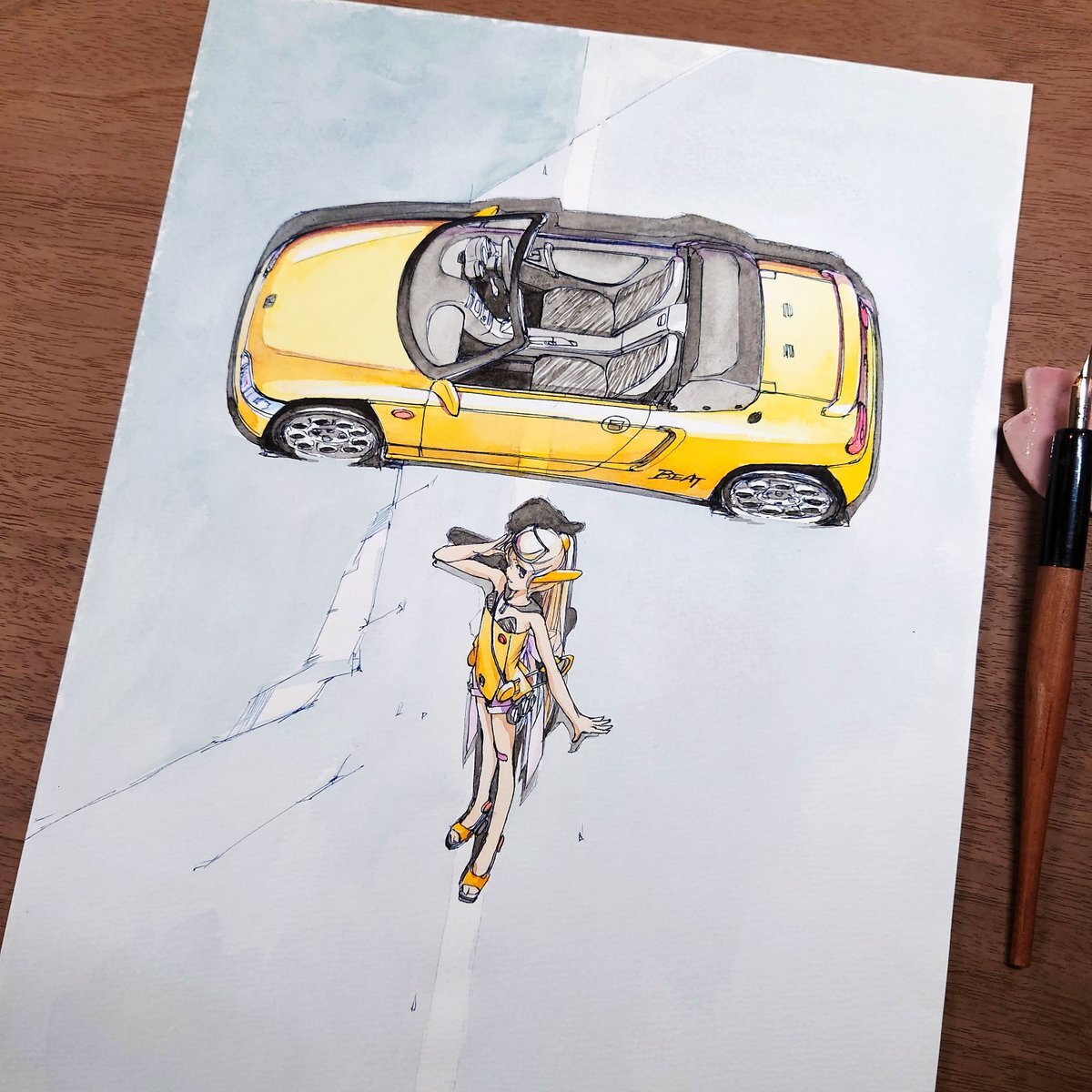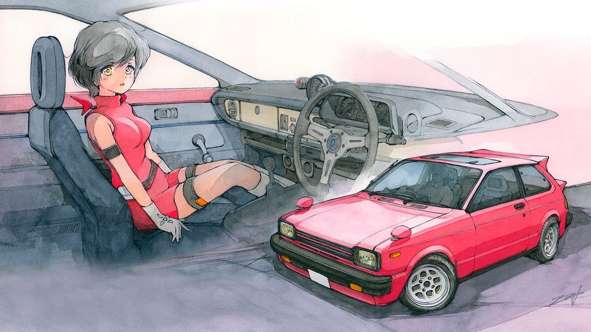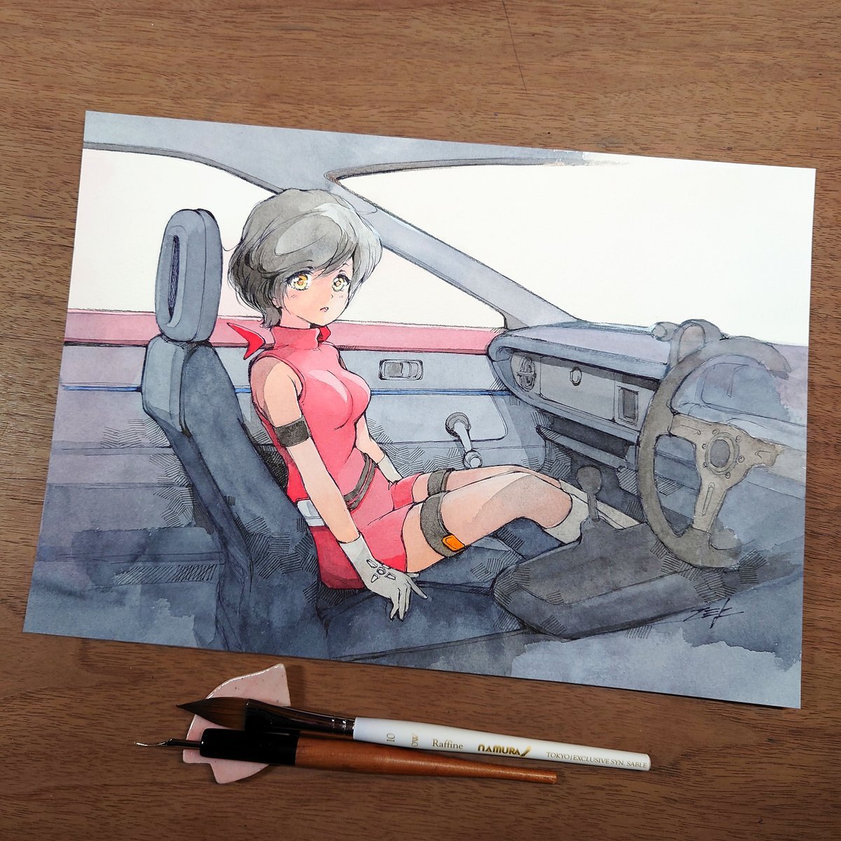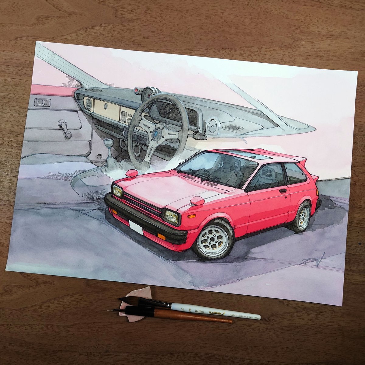 ご依頼で、KP61スターレットとその #車擬人化 イラスト、描かせていただきました。ありがとうございました。 今回は車両(インテリア背景)とキャラクターを別々の紙に描き、その2枚をデジタル合成して壁紙サイズのデータとしてもお渡ししています。 pic.x.com/BHW0b1klb4