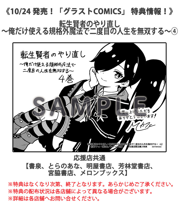 一部店舗にて『転生賢者のやり直し~俺だけ使える規格外魔法で二度目の人生を無双する~』4巻 をお買い上げいただいた方に、描き下ろし特典ペーパーをプレゼント ※特典はなくなり次第、終了となります。 ※特典の配布状況の詳細は各店舗へお問い合せください。 詳細はこちら novema.jp/comic/comic-gr…