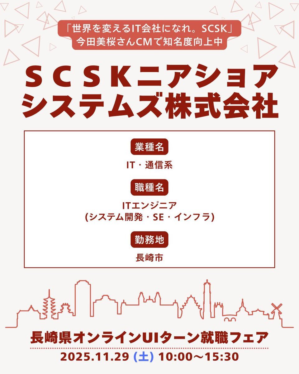 長崎県オンラインUIターン就職フェア 参加企業紹介 [企業名]SCSKニアショアシステムズ株式会社 [業種名]IT・通信系 [職種名]ITエンジニア(システム開発・SE・インフラ) [勤務地]長崎市 nagasaki-online.com #長崎 #転職 #転職フェア pic.x.com/JH4OitkZWg