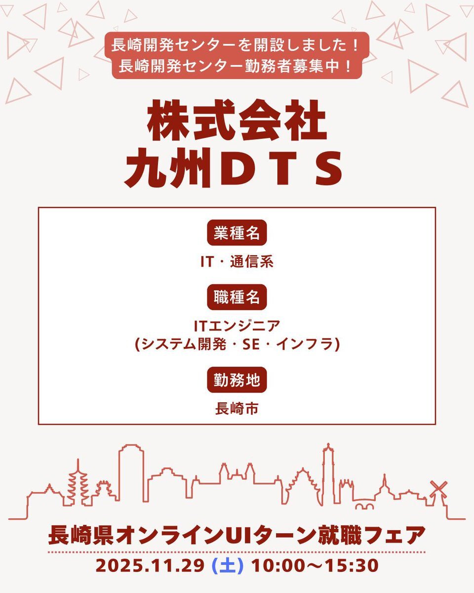 長崎県オンラインUIターン就職フェア 参加企業紹介 [企業名]株式会社 九州DTS [業種名]IT・通信系 [職種名]ITエンジニア(システム開発・SE・インフラ) [勤務地]長崎市 nagasaki-online.com #長崎 #転職 #転職フェア pic.x.com/nyXfAGkudk