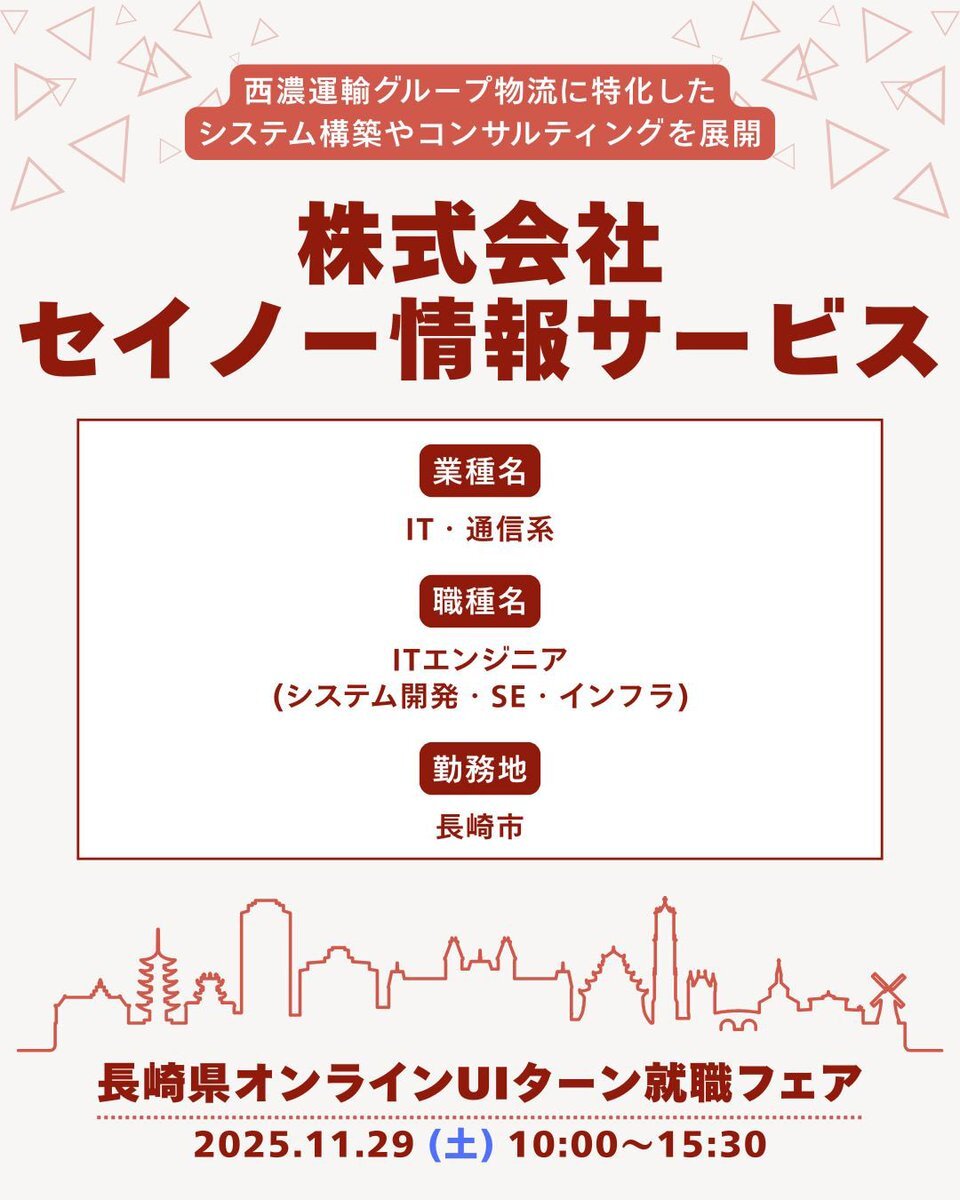 長崎県オンラインUIターン就職フェア 参加企業紹介 [企業名]株式会社セイノー情報サービス [業種名]IT・通信系 [職種名]ITエンジニア(システム開発・SE・インフラ) [勤務地]長崎市 nagasaki-online.com #長崎 #転職 #転職フェア pic.x.com/beKsqF6Qit