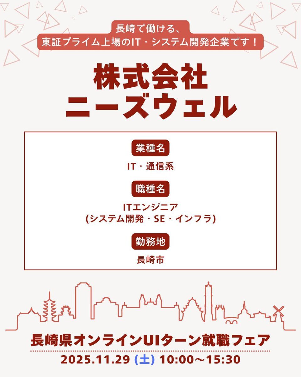 長崎県オンラインUIターン就職フェア 参加企業紹介 [企業名]株式会社ニーズウェル [業種名]IT・通信系 [職種名]ITエンジニア(システム開発・SE・インフラ) [勤務地]長崎市 nagasaki-online.com #長崎 #転職 #転職フェア pic.x.com/TzCiVC7wYO