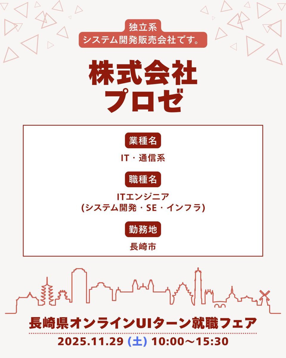 長崎県オンラインUIターン就職フェア 参加企業紹介 [企業名]株式会社プロゼ [業種名]IT・通信系 [職種名]ITエンジニア(システム開発・SE・インフラ) [勤務地]長崎市 nagasaki-online.com #長崎 #転職 #転職フェア pic.x.com/rpQUcdTPil