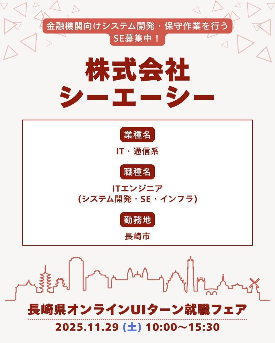 長崎県オンラインUIターン就職フェア 参加企業紹介 [企業名]株式会社シーエーシー [業種名]IT・通信系 [職種名]ITエンジニア(システム開発・SE・インフラ) [勤務地]長崎市 nagasaki-online.com #長崎 #転職 #転職フェア pic.x.com/rqPFVj1pQX