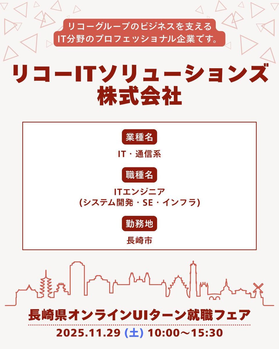 長崎県オンラインUIターン就職フェア 参加企業紹介 [企業名]リコーITソリューションズ株式会社 [業種名]IT・通信系 [職種名]ITエンジニア(システム開発・SE・インフラ) [勤務地]長崎市 nagasaki-online.com #長崎 #転職 #転職フェア pic.x.com/1hbTeN6GGU