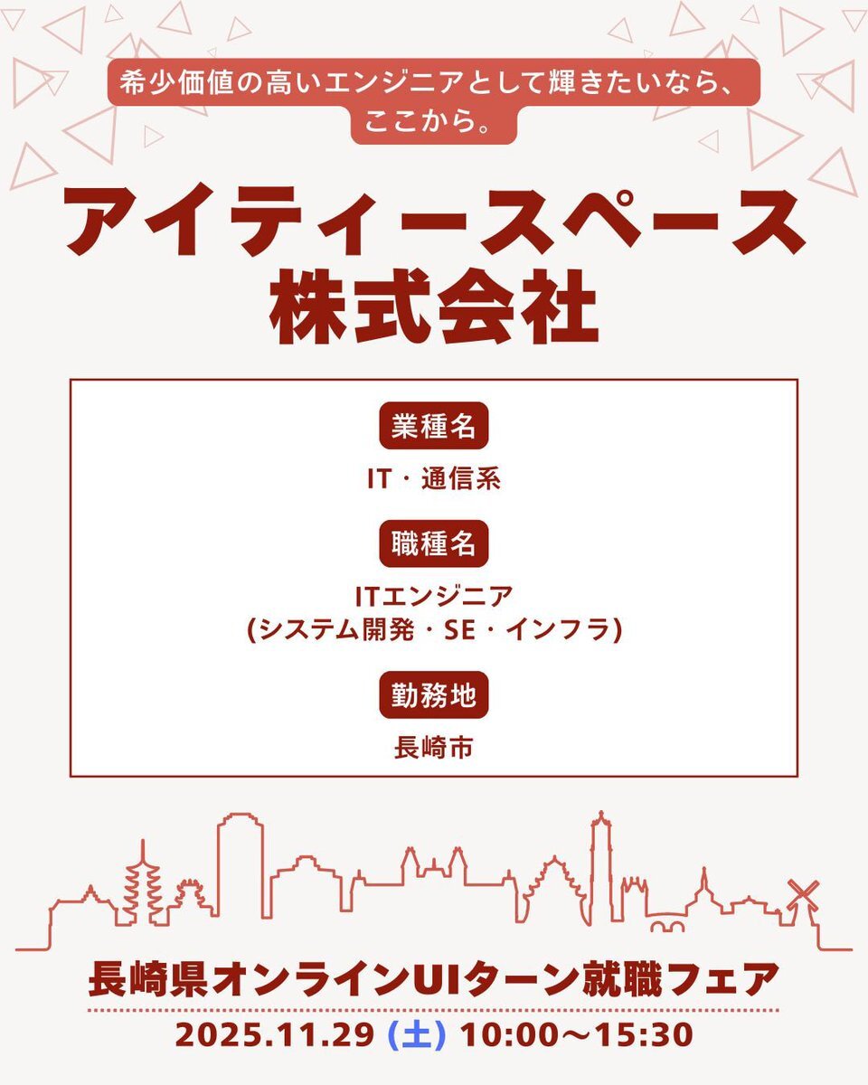 長崎県オンラインUIターン就職フェア 参加企業紹介 [企業名]アイティースペース株式会社 [業種名]IT・通信系 [職種名]ITエンジニア(システム開発・SE・インフラ) [勤務地]長崎市 nagasaki-online.com #長崎 #転職 #転職フェア pic.x.com/PT08EOMsUA