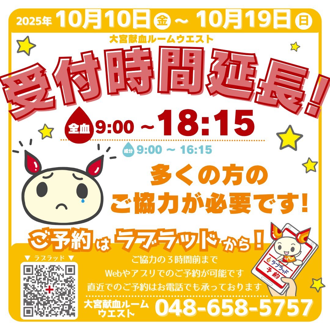 おはようございます☀️ 現在 埼玉県内では #輸血用血液製剤 の確保が 大変厳しい状況です😖💦 血液の安定的な確保のため 全血受付時間を通常よりも30分長く 【18:15】まで延長中🐍 期間:R7 10/10日(金)~10/19日(日) #大宮献血ルームウエスト でのご予約は 【048-658-5757】までお願いいたします! pic.x.com/kLDxPblZRD