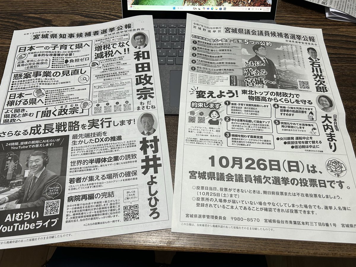 ◎10.20 宮城県議会。 今日は、明日の #農林水産委員会 を前に、委員長・副委員長と農政部・水産林政部との意見交換。主な項目は、10月初旬の成功裏に終えた #第48回全国育樹祭 の開催成果です。議会後は陳情対応等々。 ところで、帰宅したら、やっと知事選挙と宮城野区県議補欠選挙の #選挙公報 pic.x.com/qmtNPu3qEL