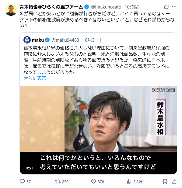 むしろ、#農業の株式会社化 を認めず、農協(JA)の奴隷のままにしておきたいのだ、#鈴木憲和 は 価格の高止まりが良い事だと思っているならば、農水省なんて無い方がいい #鈴木憲和やめろ それだけだ、#洋服大臣 でもやれば? 工業製品と、年1回しか収穫できない米と、比較になるとでも? x.com/siroiwannko1/s…