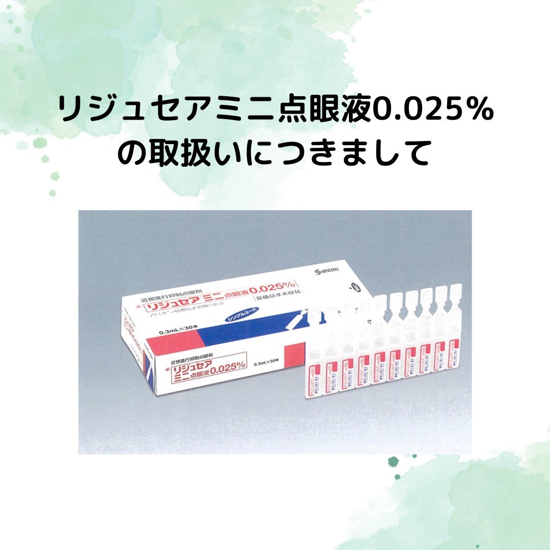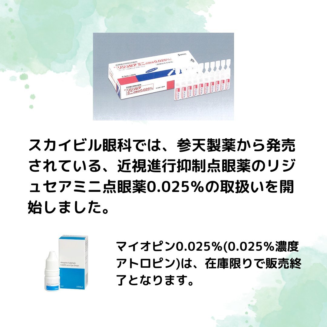 ・お知らせ・ スカイビル眼科では、近視進行抑制点眼薬のリジュセアミニ点眼薬0.025%の取扱いを開始しました。 マイオピン0.025%(0.025%濃度アトロピン)は、在庫限りで販売終了となります。 #スカイビル眼科 #近視進行抑制 #低濃度アトロピン #マイオピン #リジュセアミニ #オルソ pic.x.com/Rm6XzBrPll