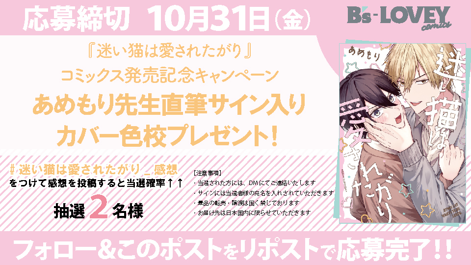 / 🐈‍⬛「#迷い猫は愛されたがり」発売記念キャンペーン💕 \ 抽選2名様に #あめもり 先生直筆サイン入りカバー色校をプレゼント🎁 ①@BSLOVEY をフォロー ②注意事項を確認しこの投稿をRP🔄 #迷い猫は愛されたがり_感想 をつけて感想を投稿すると当選確率UP🎯 📅応募締切2025/10/31 23:59📅 pic.x.com/qDLQwGmyOb