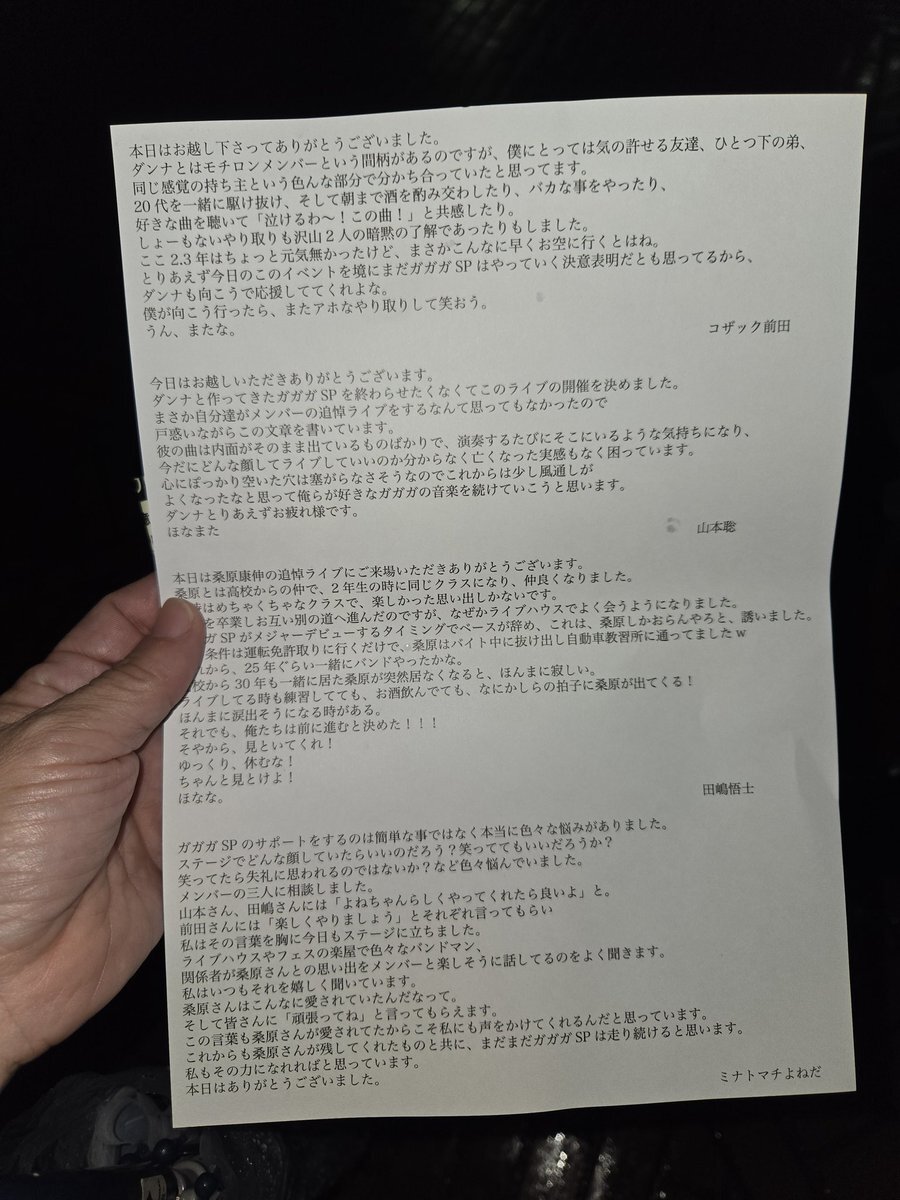 こちら、今日のライブ後に配られたメンバーからのメッセージです。今日来たくても来れなかった人たちへ。 #ガガガSP #桑原康伸 #追悼 pic.x.com/9bJskrwUGb