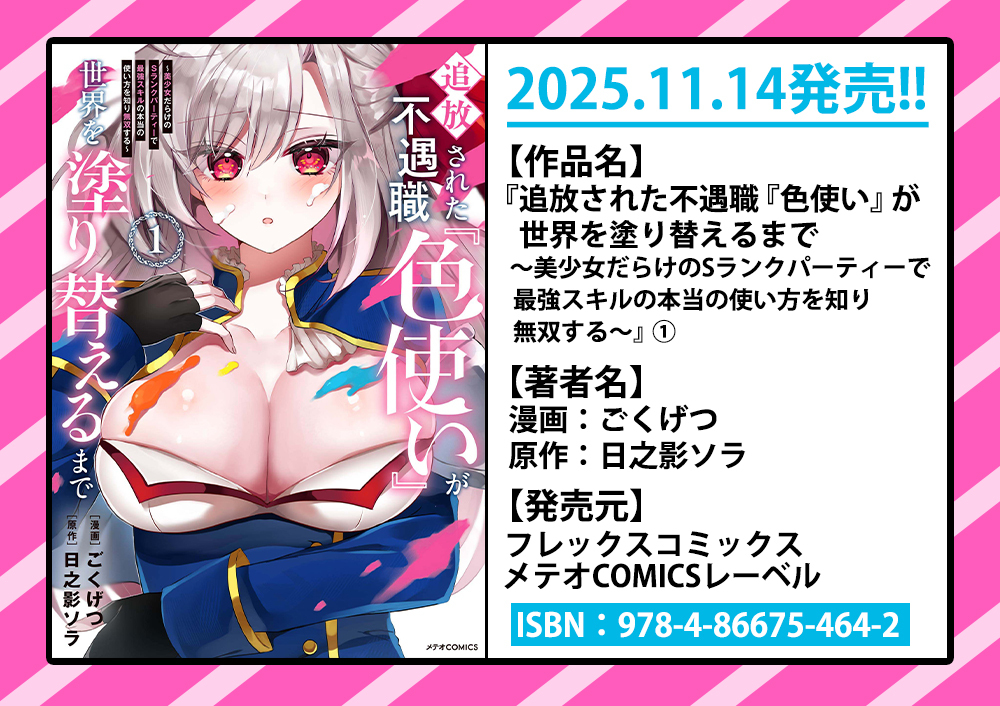 ✨🔥11/14発売 COMICメテオ新刊案内🔥✨ 1⃣『追放された不遇職『色使い』が世界を塗り替えるまで~美少女だらけのSランクパーティーで最強スキルの本当の使い方を知り無双する~』第1巻 漫画:ごくげつ / 原作:日之影ソラ amzn.asia/d/41LfCzw
