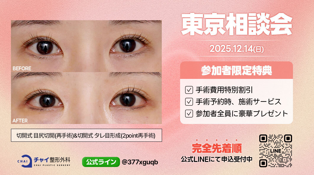 残席わずか💨 12/14(日)はチャイの東京相談会へ🇯🇵 目の再手術も自信あり♥ 代表院長の丁寧なカウンセリングを通して 一人ひとりの目の状態を徹底分析💉 手術内容: 切開式 目尻切開(再手術)&タレ目形成(2point 再手術) 公式LINEよりカウセ会に申し込む🗼 line.me/R/ti/p/@377xgu… #逆さまつげ pic.x.com/I8aW78fbNc x.com/chai_psjp/stat…