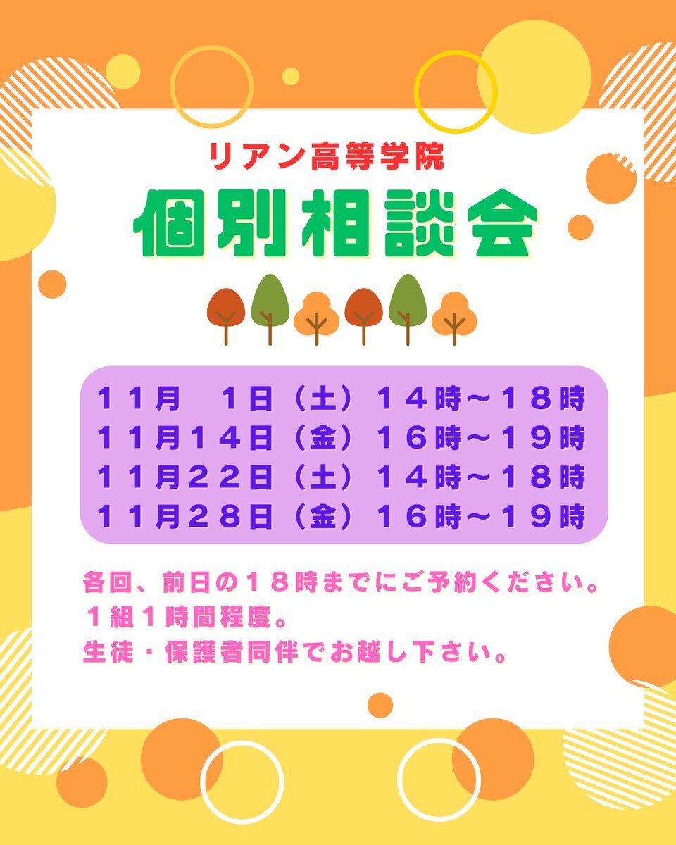 個別相談会のお知らせ リアン高等学院では、 11月に個別相談会を開催します。 事前予約をお願いします。ご連絡お待ちしています。 #リアン高等学院 #中京高校 #通信制サポート校 pic.x.com/Fxyf5znZ6b