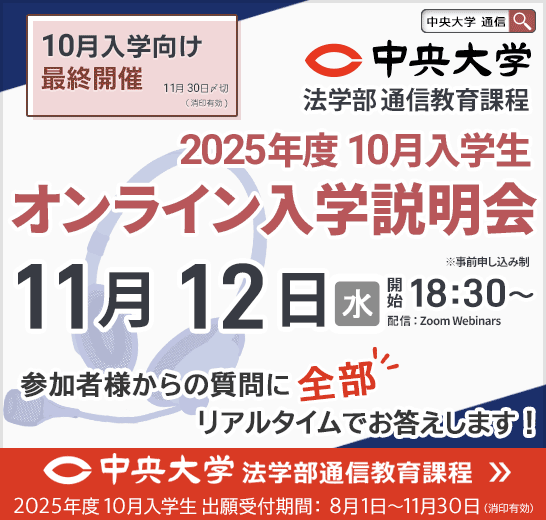 \\✨出願〆切迫る✨// 🎓オンライン入学説明会 ⚖️中央大学法学部通信教育課程 🗓️2025年11月12日(水) 🍁2025年度10月入学生 🌸出願期間:8月1日~11月30日迄 📣< 2025年度10月入学生向けは11/12が最後です‼️ tsukyo.chuo-u.ac.jp/guide/guidance/ #中大通教 #入学説明会 #通信制大学 pic.x.com/9Z4riTXGS0