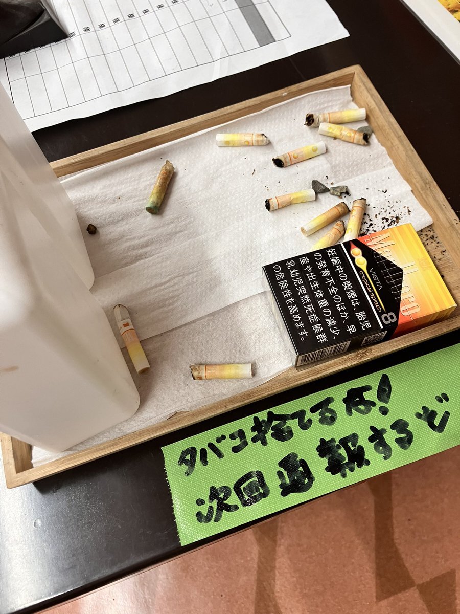 今朝出勤すると、店頭に沢山の吸い殻と空き箱が放置されていて、さらに『タバコ捨てるな!次回通報するぞ』というメッセージまで添えられてました。 当店は3年以上も駅前や店舗周辺のゴミ拾いを継続しており、極めて心外な行為と受け取りました。 次回やったら通報します。 #通報案件 #営業妨害 pic.x.com/hh77VxhIlJ