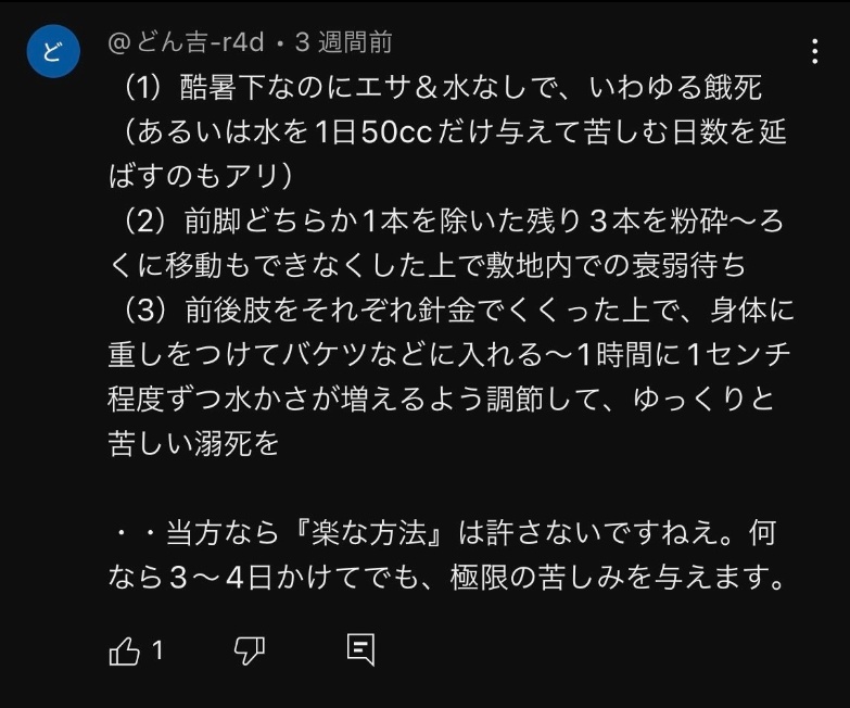 猫を捕獲しては処刑をしている日本人のチャンネルがいるという情報が入ってきました。チャンネル名は「野良チャンネル」何匹も猫を捕獲する度に処刑確定と言い、処刑動画は非公開にしているとの事で見る事はできません。動画内では少なくとも4匹以上は捕獲されています。自宅は長崎大学熱帯医学研究所